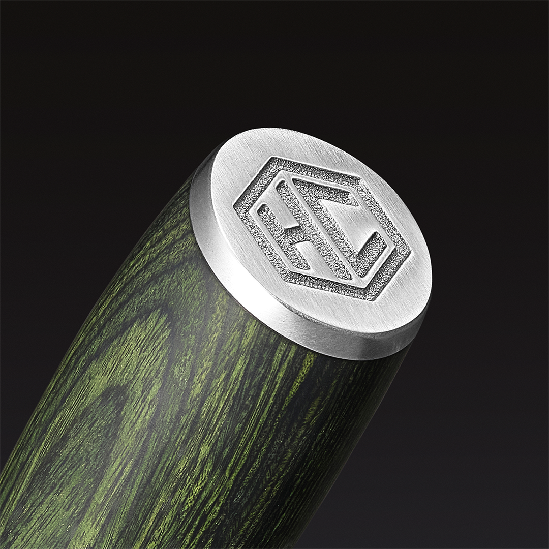 - Arched design and amazing ergonomic grip features a unique green Pakkawood handle, infused with resin to increase resistance to moisture, cracking and splintering.