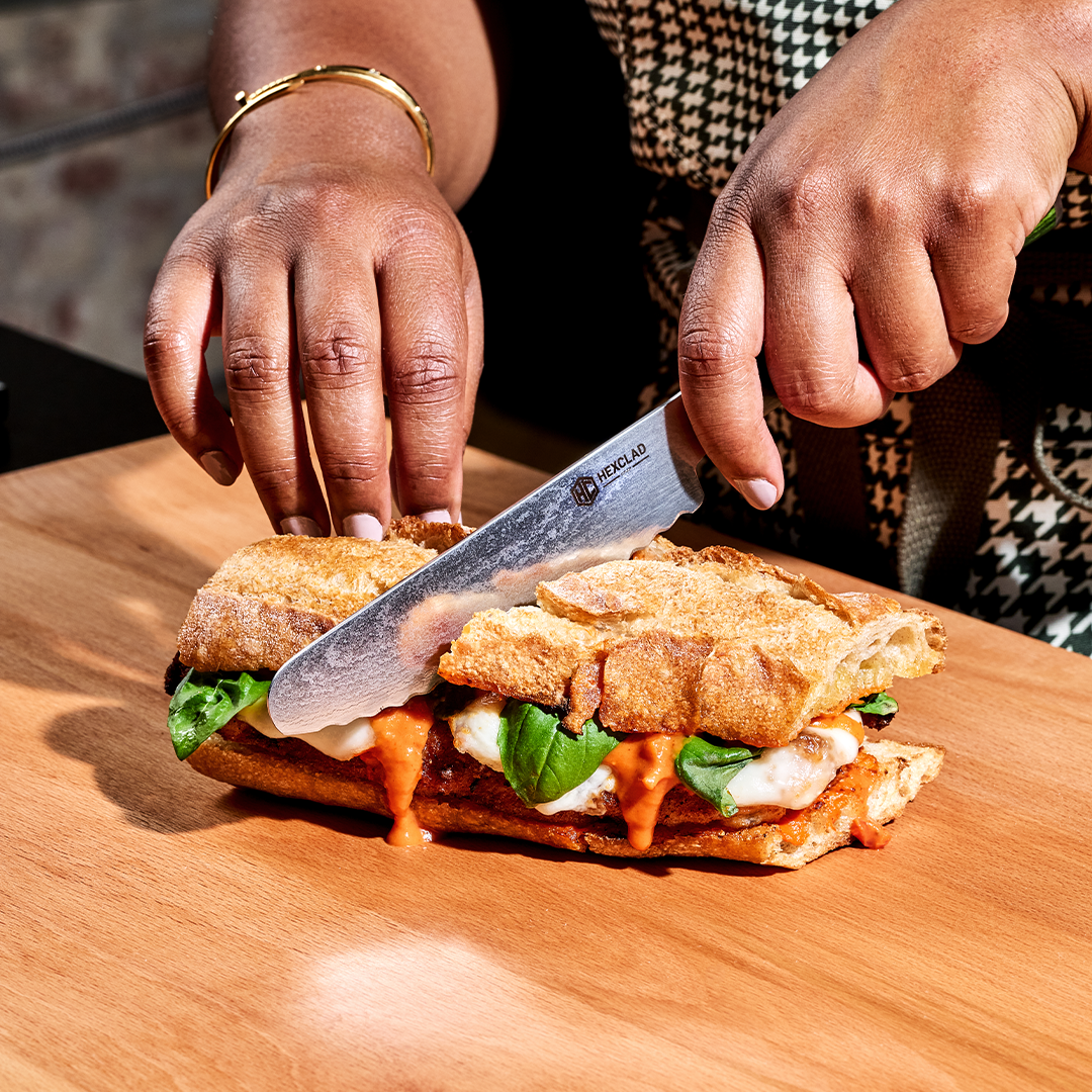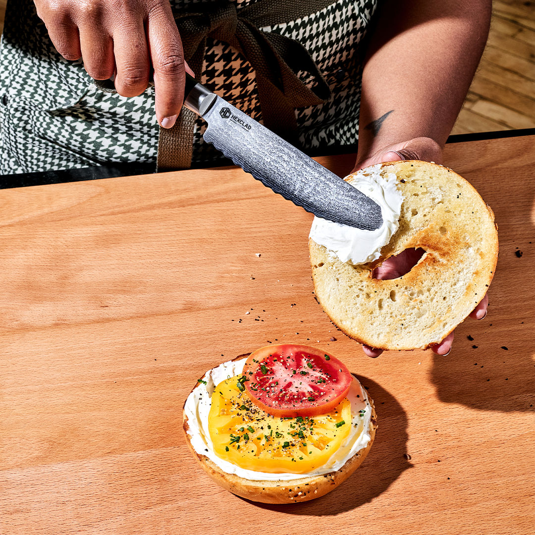 - 5-inch sandwich knife has scalloped serrations designed to cut through the crispy, soft crust of breads and bagels, and effortlessly through delicate-skinned fruits and vegetables.