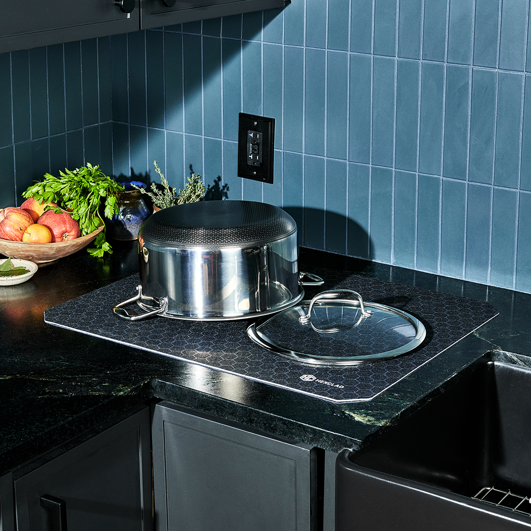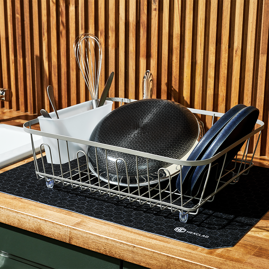 From the clutter in the corners to the dishes situation, it¡¯s challenging to keep a kitchen clean and dry. A rumpled towel to air-dry dishes isn¡¯t gonna cut it any more, because this isn¡¯t college. Meet the new HexClad Dish Drying Mat. Made from an absorbent, quick-drying material that can hold up to a cup of water, it¡¯s just the thing to throw under a dish-drying rack, spread out on the counter for extra silverware, or use as a protective layer under small appliances. Its waterproof backing keeps moisture from seeping through, you can trim the extra-large surface to fit your counter¨Cit won¡¯t fray¨Cand it¡¯s machine-washable. A stable, slip-resistant backing and a low-profile surface help keep stemware stable. Bonus: It¡¯s good-looking, and made in the USA.