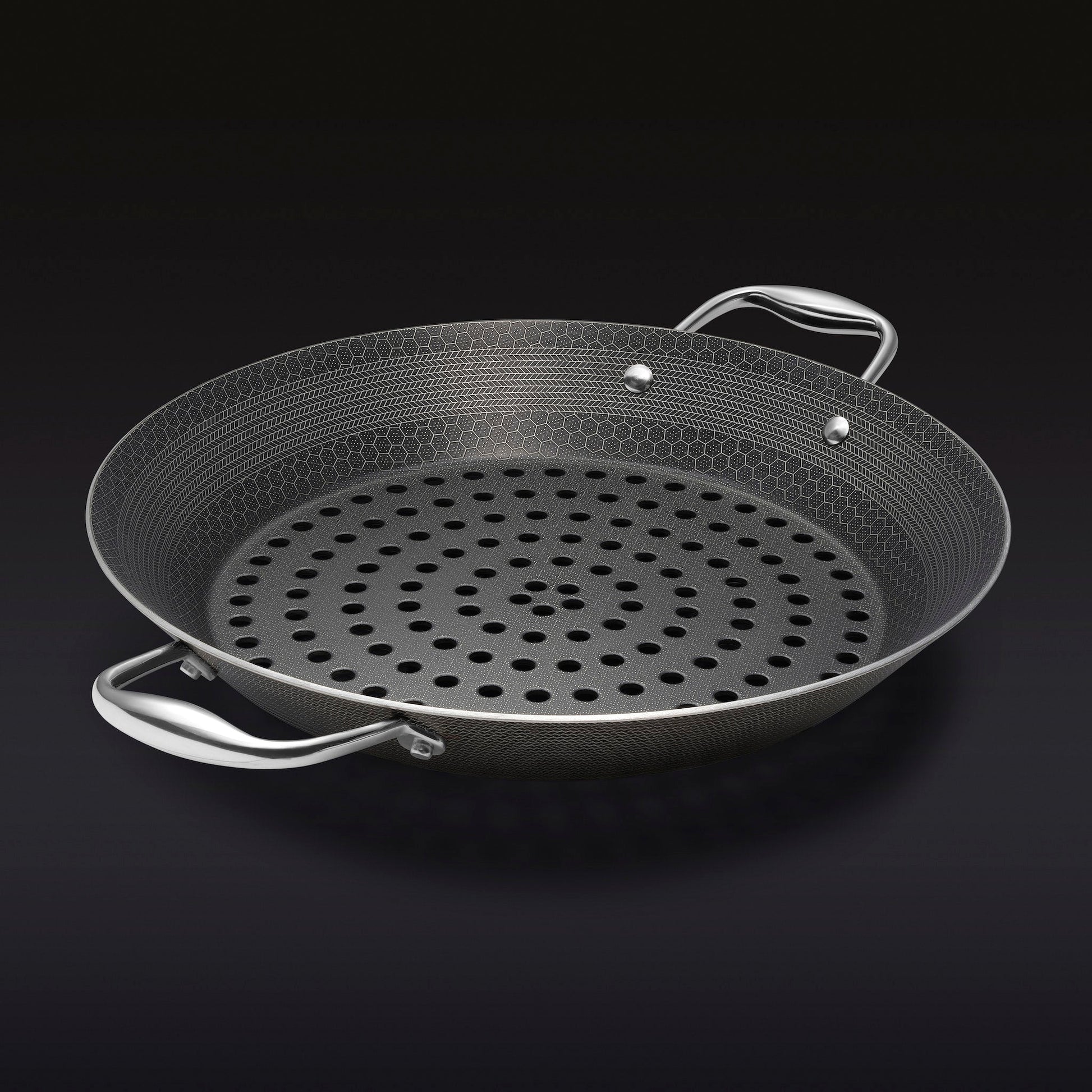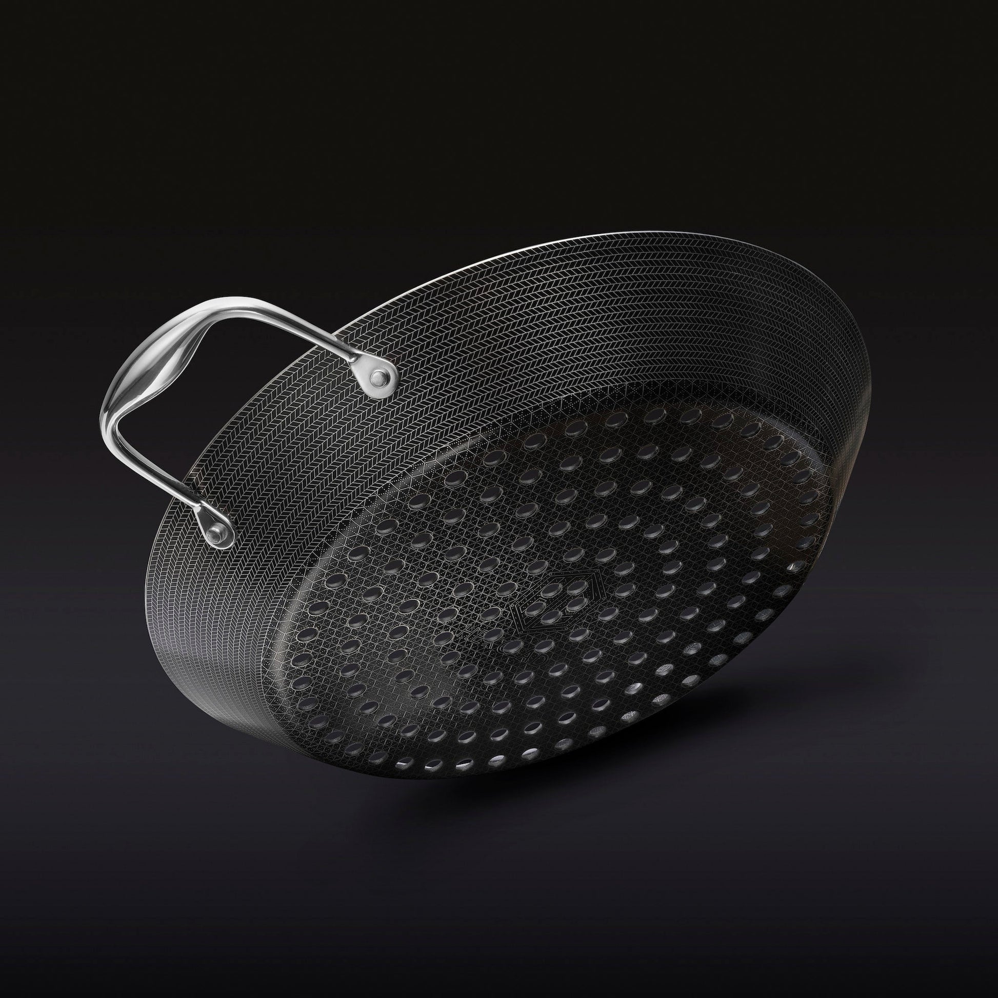 The HexClad BBQ Grill Pan combines the searing power of stainless steel, the durability of cast iron, and the convenience of nonstick, all into one versatile grilling pan. Cook an entire meal on the grill without going back and forth to your kitchen while delivering the same smoke and char flavor you love from traditional grilling.