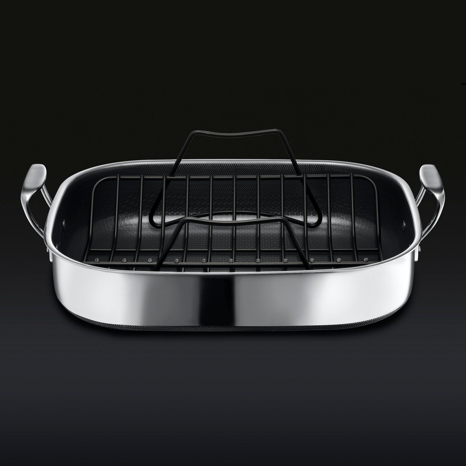 Get the most out of your roast. The HexClad Hybrid Roasting Pan features our Hybrid surface, which combines stainless steel and our proprietary TerraBond? ceramic nonstick to give you a feast of benefits. It all starts with even heat distribution for perfect roasting and baking. It¡¯s also metal utensil safe so that you can use knives, forks, and even electric mixers, right on the surface. And the nonstick surface makes it easy to clean. Always ready for your next dinner party, it comes with a rack that prevents your turkey or roast from touching the bottom of the pan and allowing the drippings to fall through. It¡¯s also incredibly versatile, going from double-burner stovetop to oven with no problem. This is our largest pan to date, so whatever you¡¯re cooking, from turkeys to casseroles, you can go big.