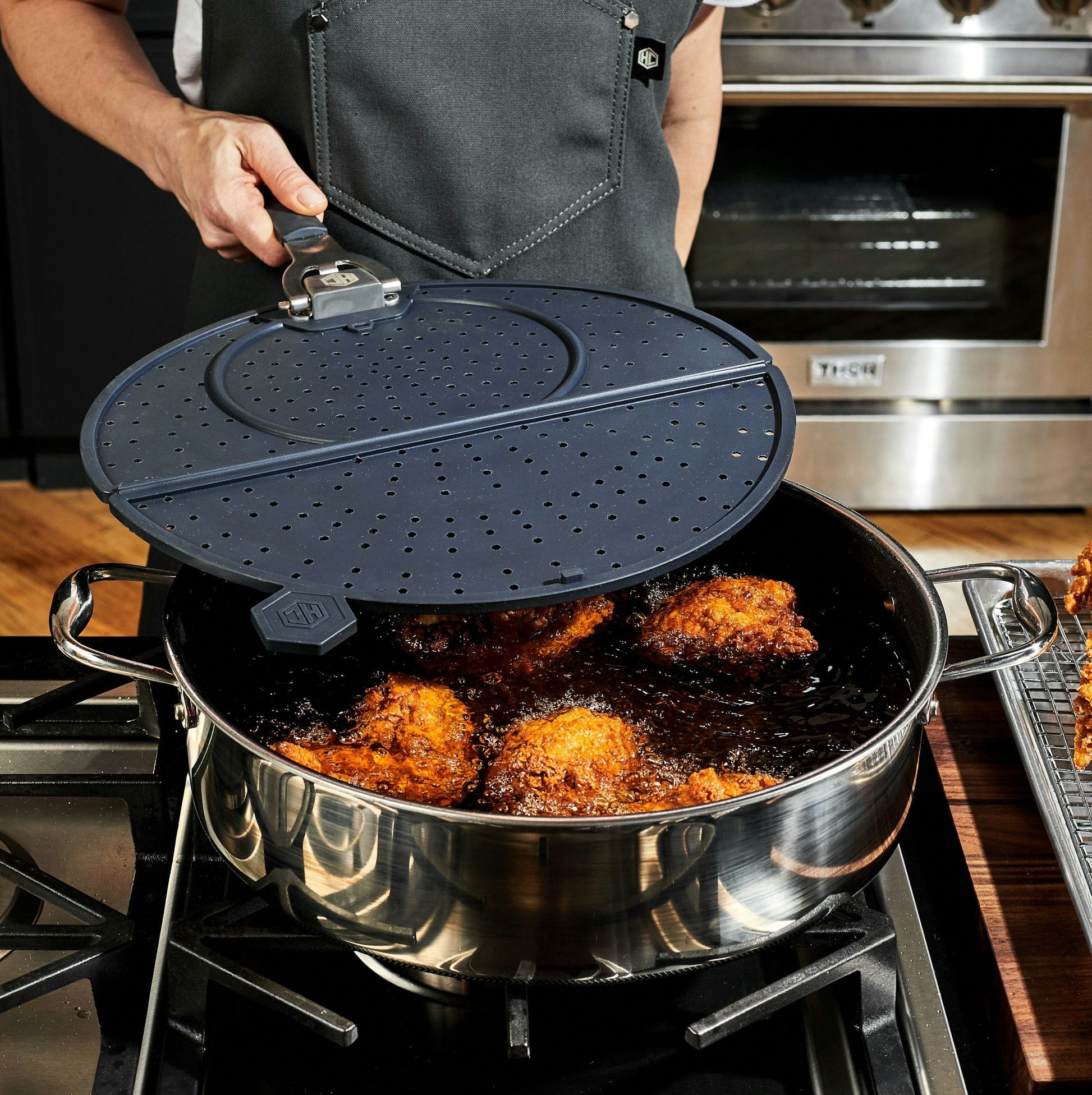 You¡¯ve just fried chicken right on the stovetop. (Go, you!) But then you see a fine mist of grease everywhere. Sigh. Enter: our new, folding splatter screen. Built to last, this heat-resistant silicone screen features a durable stainless-steel skeleton for added support; it also fits pans up to 12? inches wide. The wonderful thing about a grease splatter screen is that it shields you and your cooking surface from sputtering hot fat without trapping in moisture (as a lid does). That keeps food crunchy and crispy¨Cinstead of soggy. When you¡¯re done cooking, pop the splatter screen right in the dishwasher. It¡¯s a win-win.