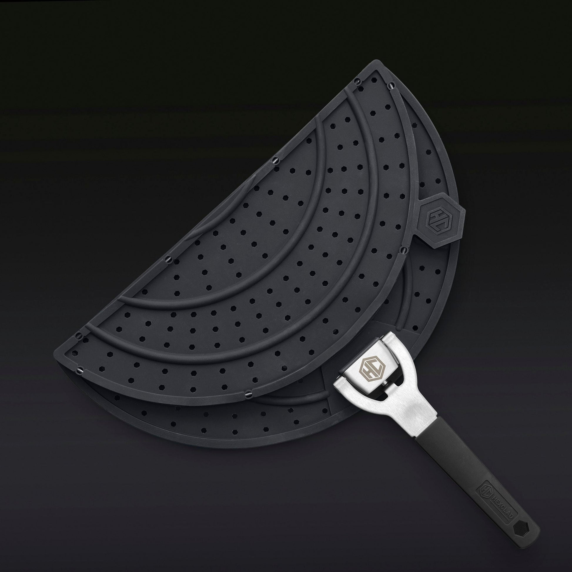 - Stay-cool silicone handle with stainless-steel locking hinge.