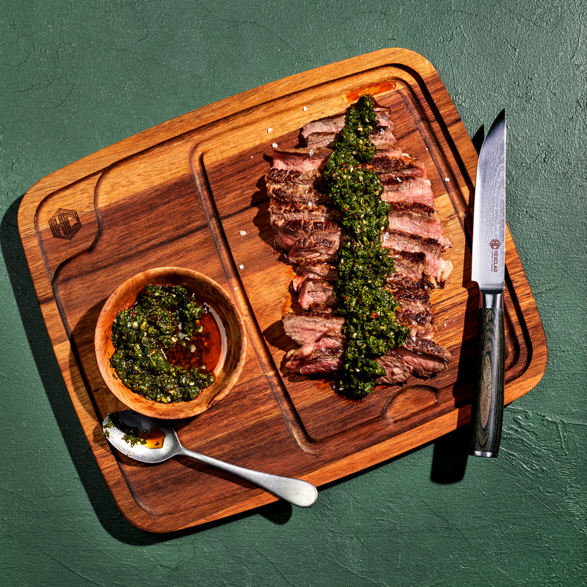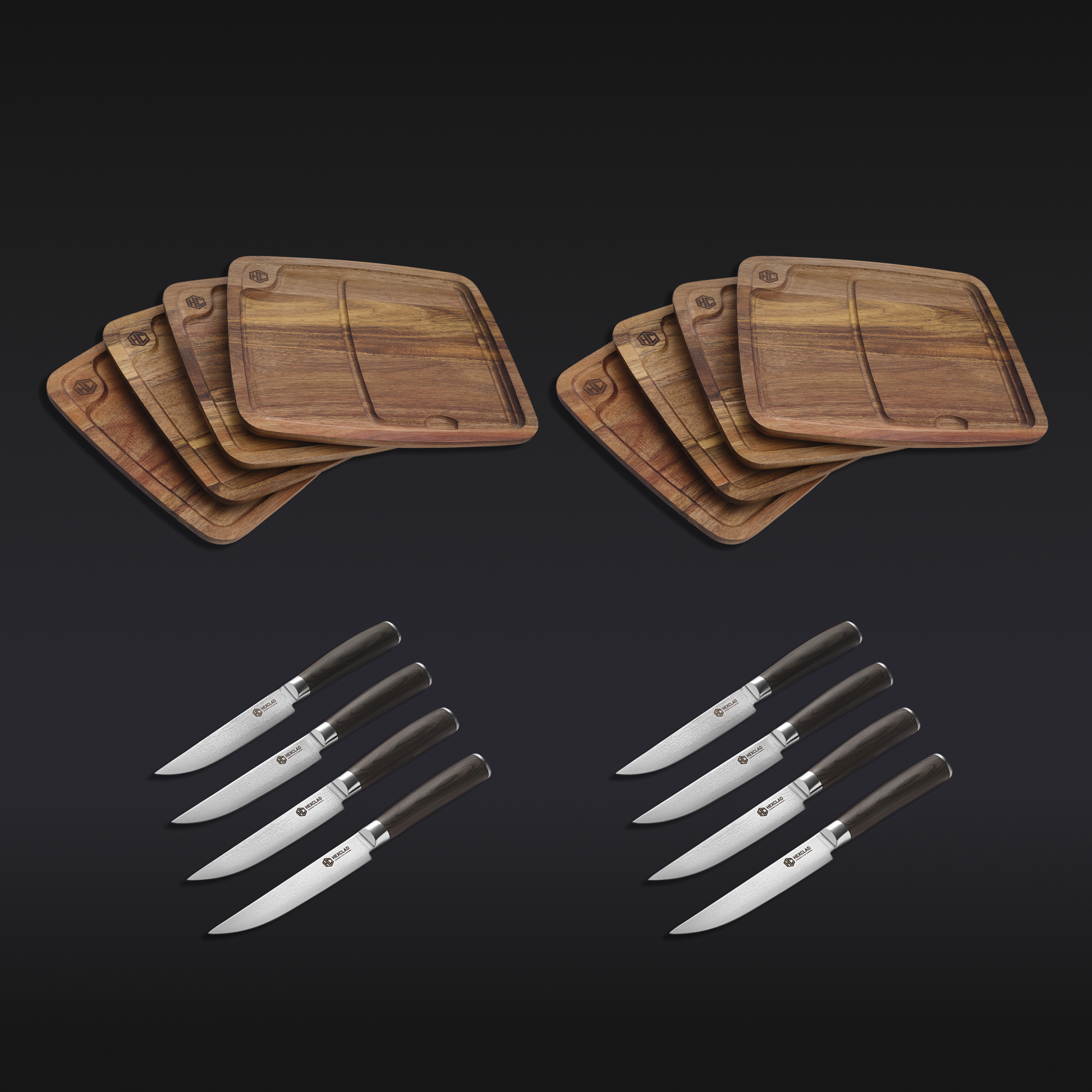 It¡¯s the ideal steak night pairing: our four-piece Japanese Damascus steel steak knife set and four Bistecca Steak Plates, modeled after the cutting boards that Bistecca Fiorentina has been plated on for centuries. The wood surface protects these high-quality blades, while the knives glide through proteins like butter.